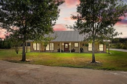 Peaceful Country Living Meets Modern Barndo Charm on 9+ Acres. Welcome home to this stunning 4-bedroom barndominium nestled on over 9 acres of beautifully maintained land — complete with a stocked pond, fully fenced pastures, and all the extras for a true country lifestyle. Whether you’re raising show animals, keeping horses, or simply craving wide-open space, this property has it all. Inside, you’ll find polished diamond-cut concrete floors, custom concrete countertops, and a concrete fireplace hearth with built-in storage boxes — the perfect blend of rustic durability and modern design. The vaulted ceiling with exposed wood beam creates an airy, open feel, and the split floor plan offers privacy for the spacious primary suite. Natural light pours through the home, highlighting its open-concept layout that’s ideal for gatherings and family living. Step outside to enjoy front and back covered porches, a large carport, a cedar playhouse, and a fenced garden area — which could easily double as the perfect chicken coop setup. Cast a line in your very own pond offering perch and brim for your catch of the day, or relax while your cattle or horses graze the lush, income-producing hay pastures. A separate building on the property offers water, electricity, sewer, and laundry — currently used as an office but ideal for guest quarters, in-law space, or hobby studio. It even includes a 30-amp RV hookup for visiting guests. Recent updates bring peace of mind with a new HVAC system, water heater, septic lines, aerobic system, fencing, and spray foam insulation. With an Ag exemption already in place, you’ll enjoy low taxes and low stress — and speaking of peaceful, your closest neighbors are guaranteed to be quiet forever (yes, the small, well maintained cemetery next door means no noisy parties!). If you’ve been searching for the perfect blend of modern comfort, rural functionality, and serene surroundings — this turn key ranch ready home on 9+ acres is the one. Call for your private tour today!